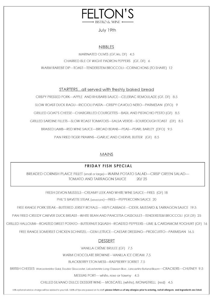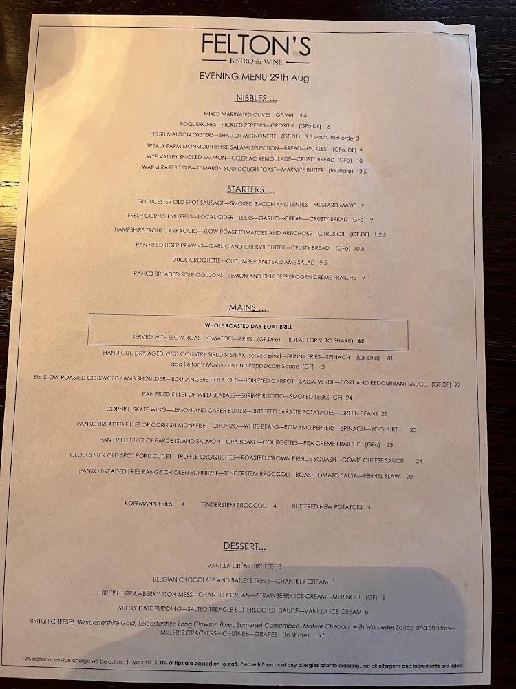Located at 2 Vine St, Evesham WR11 4RE, Felton's Bistro and Wine has carved its niche as a beloved dining spot. It's nestled conveniently in the town center, making it accessible for locals and visitors alike. The inviting decor fosters a warm and romantic atmosphere, perfect for both solo diners and gathering with friends or family. With wheelchair-accessible seating, everyone can enjoy what Felton’s has to offer. Open daily, this bistro adapts effortlessly from vibrant lunch scenes to intimate dinner settings, ensuring a delightful culinary experience throughout the week. Its reputation is built on serving exceptional dishes crafted from fresh, seasonal ingredients, paired seamlessly with an impressive wine list. Friendly and knowledgeable staff offer top-notch service, enhancing the overall dining experience and leaving guests eager to return.